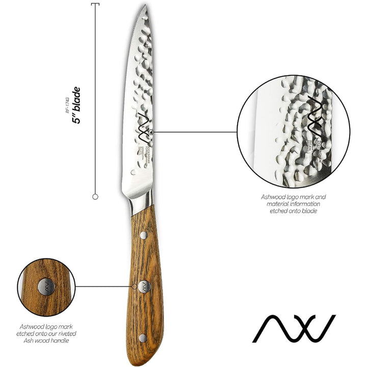 Each knife has a stunning hammered blade which is both eye-catching and practical as it ensures nothing sticks to the blade while in use. Ashwood handles are durable and comfortable to hold while adding a classic element to the design.