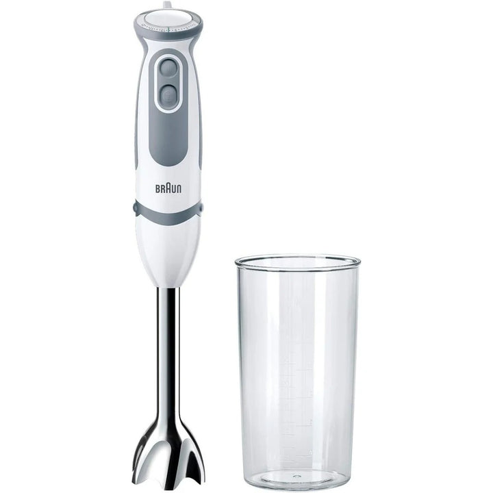 Hand blender with metal Power Bell anti-splash foot, ultra hard stainless steel blades for fi ne results. Smart Speed uninterrupted variable speed control. Powerful, silent motor for fastest and fi nest food processing results. Easy click detachable dishwasher safe shaft.1.25L blender with additional ice crushing blades, 350ml chopper, 600ml BPA free plastic beaker, stainless steel whisk.
