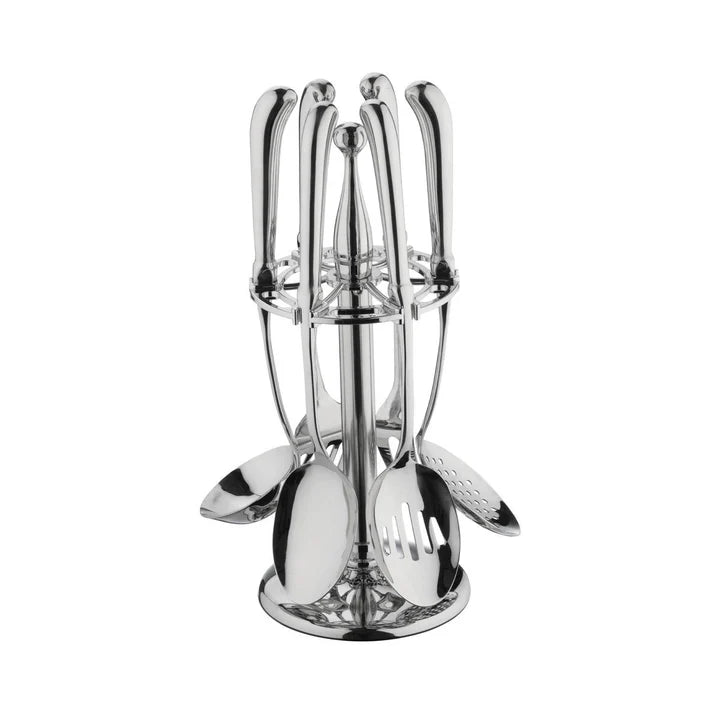 Each piece features cool-touch ergonomic handles for safe, comfortable use, while the included compact stand keeps your utensils neatly organised and within easy reach. With a mirror-polished finish, these utensils are as elegant as they are functional — perfect for everyday cooking or as a standout gift.