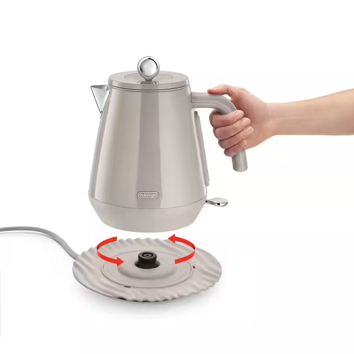 Celebrate your own uniqueness and eclecticism with the masterfully modelled De'Longhi Eclettica kettle. Its unmistakable design is rich in Italian style and complete with modern, gentle lines, making breakfasts and tea or coffee breaks a pleasure. This 3000W electric kettle with a 360° cordless base comes with a stylishly crafted saucer to reflect your mood.