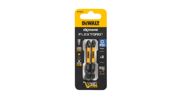 The DeWALT PZ2 FLRQ Screwdriver Bit is designed for extreme performance, with features such as FLEXTORQ technology for increased resistance to wear and shock, hardened steel for durability, and a contoured torsion zone for longer bit life.