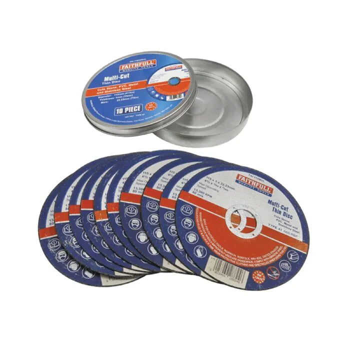 These Faithfull Multi-Cut Cutting Discs will cut a wide range of materials used in the construction and fabrication industries. At only 1mm thick they are able to provide a fast cutting action with less waste and dust.