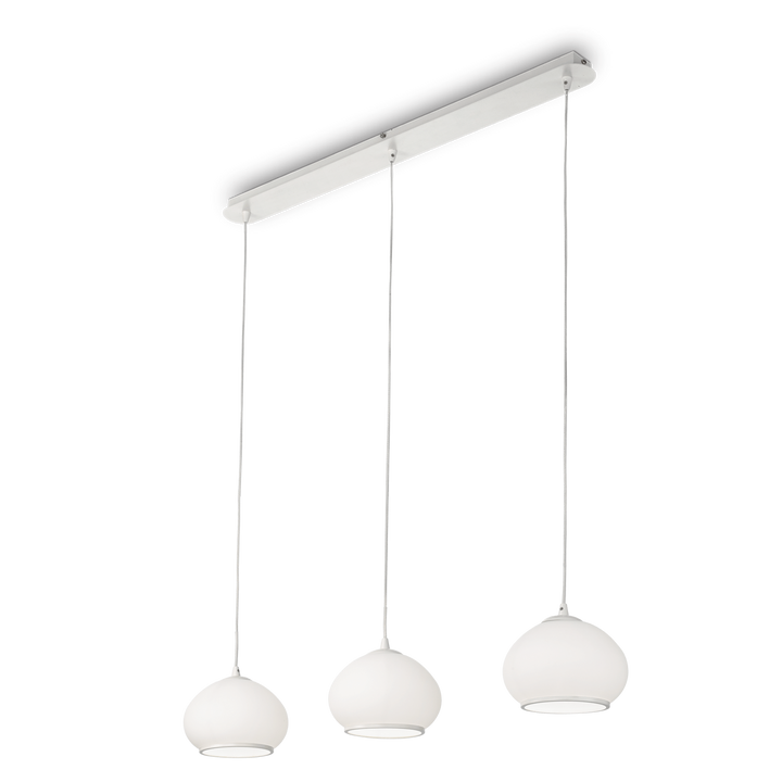 Metal frame and ring positioned on the lower edge with satin white enamel finish. White blown acid-etched glass diffuser. Steel cables adjustable in length with automatic devices.