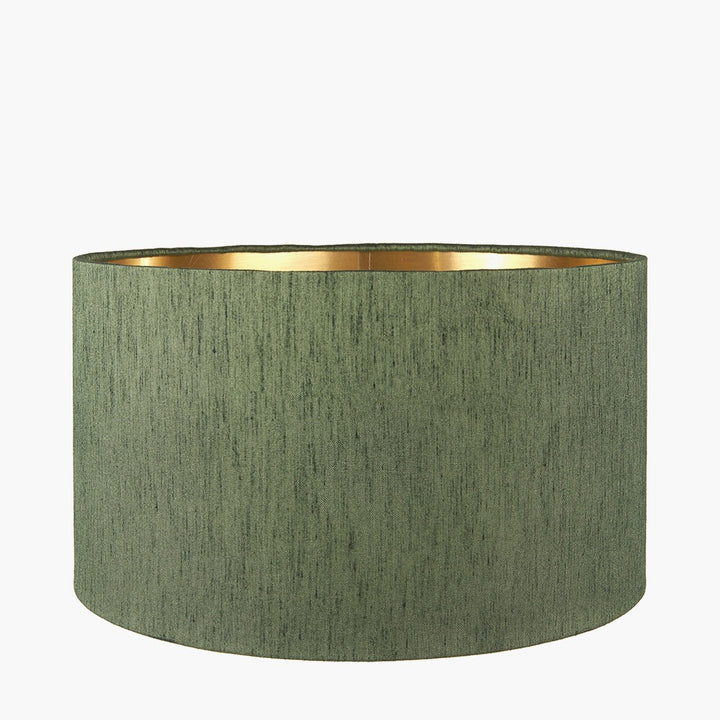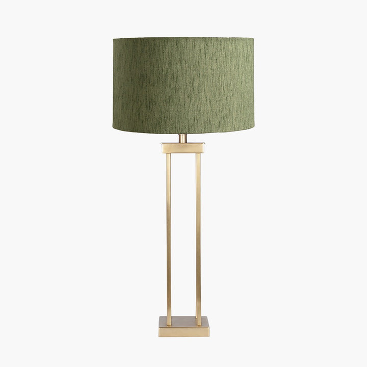 Langston Satin Brass Metal Column Table Lamp Base with Stellan 40cm Green Slubbed Silk Mix Gold Lined Cylinder Lampshade
