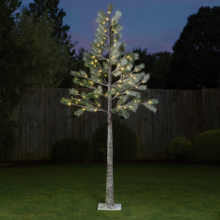 Snow-dusted LED pine tree – natural and glowing outdoors.