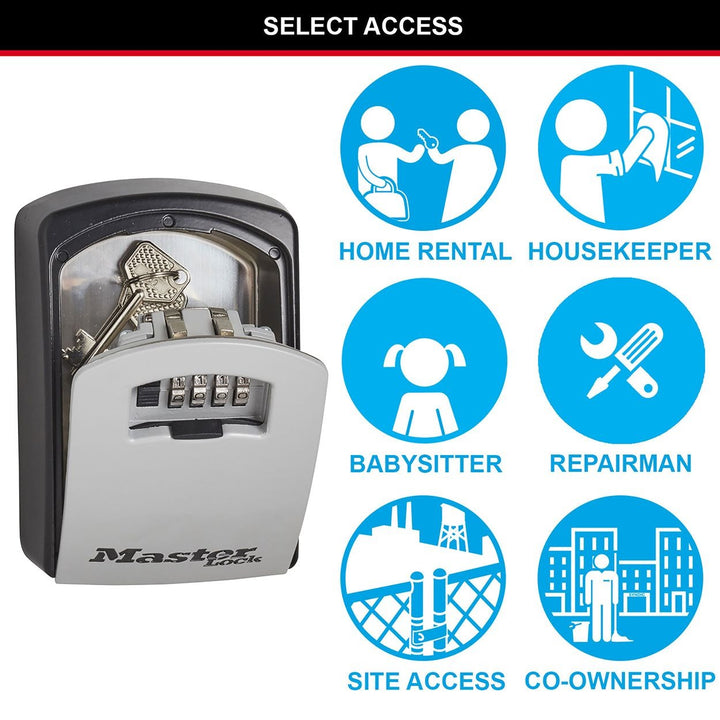 The Master Lock key lock box features a 106mm wide metal body for durability and accepts multiple house, and car keys and access cards. Stop hiding your keys under the doormat or under a flower pot: Select Access is the perfect solution to share access to your keys. The wall mount design offers permanent installation. Set-your-own 4-digit combination for keyless convenience and increased security. The shutter door protects combination dials from weather, dirt and grime.