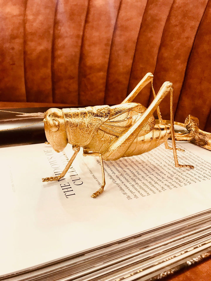 Bright gold grasshopper sculpture, the ultimate quirky accessory! Ideal for shelf or fashion book styling.