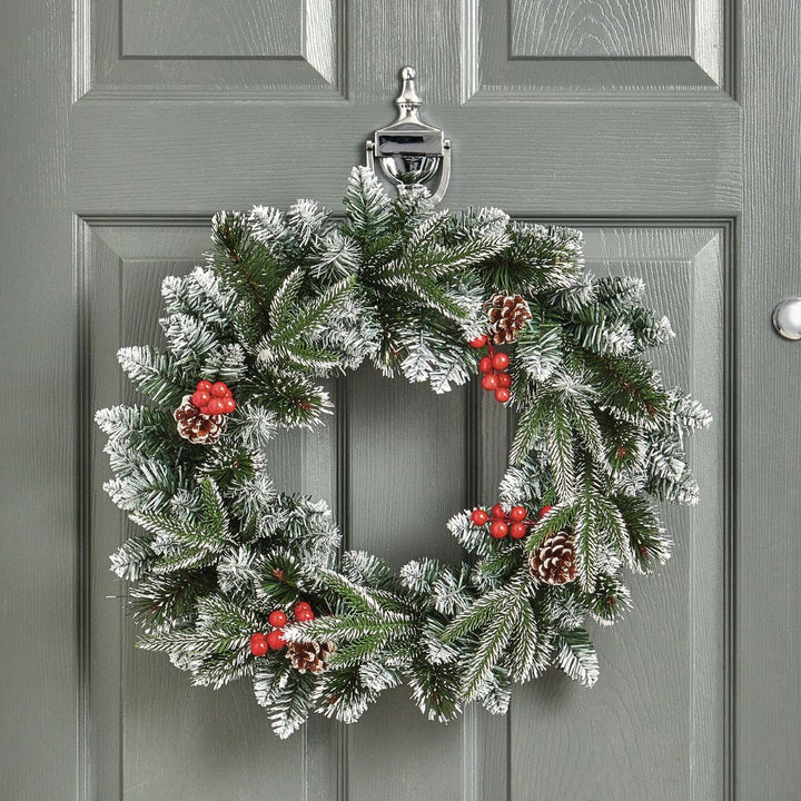 Bring festive charm to your home with the New Jersey Frosted Wreath, featuring a snowy, winter-inspired design accented with vibrant red berries. Perfect for doors, mantels, or walls, this 50cm wreath adds a touch of seasonal elegance and warmth to your décor.