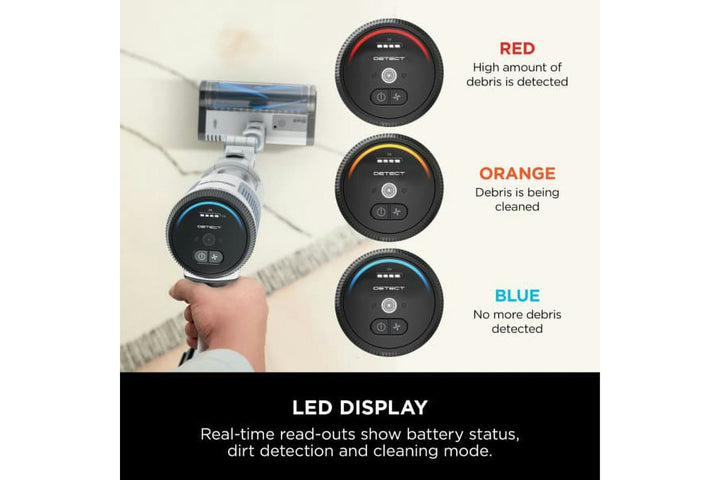 Real-time LED screen shows battery life, dirt detection, and cleaning modes.