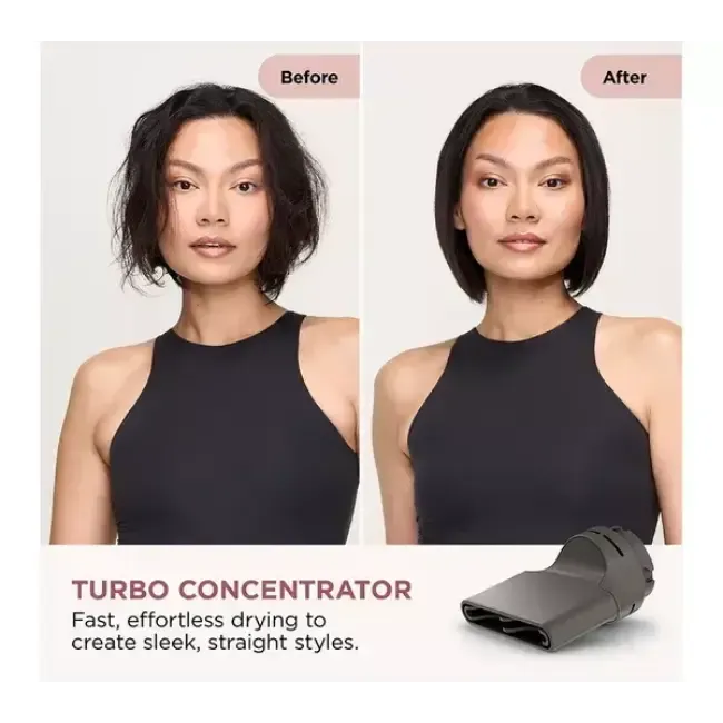 - Turbo Concentrator - Designed to give you sleek, straight styles with no heat damage, the concentrator features a 360° rotatable nozzle - adjust it to your desired angle for easy, controlled styling. Perfect for every hair type.