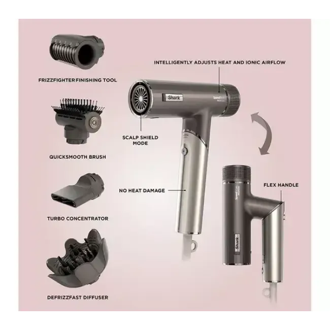 Meet the Shark SpeedStyle Pro FLEX Hair Dryer System. Get for flawless, salon-quality looks at home. Powerful, lightweight hair dryer for all hair types. 4 styling attachments for flawless, salon-quality looks with no heat damage & less frizz. Designed for high performance in a compact design that flexes for easy storage, without compromising power.