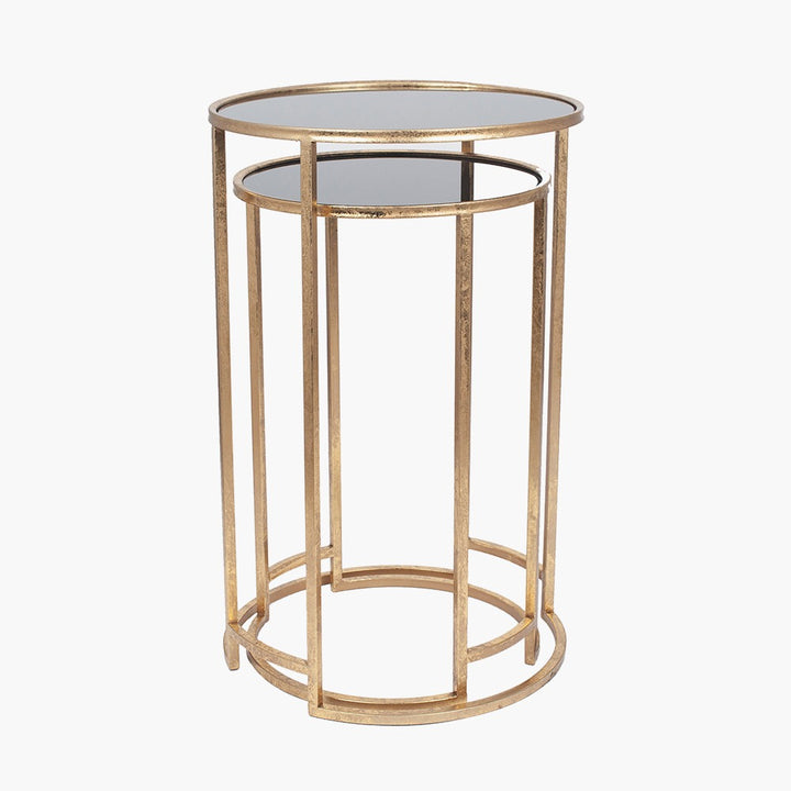 The Veneziano tables add a touch of rich gold colour to your home. The side tables are circular with an antique gold metal coloured open frame and a black smoked glass top, incorporating both glamour and functionality. These gorgeous round tables are nested and feature a unique horseshoe design that allows you to easily place the smaller side table underneath the larger one for a space-saving storage solution.