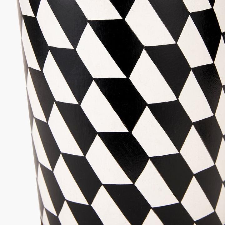 Our Victor metal table lamp base is another welcome addition to our Indian, handmade tea caddy table lamps. The on-trend monochrome design on the lacquered iron base will make a stylish and quirky statement in any interior. The wonderfully versatile black and white geometric design looks fabulous with the black silk mix cylinder lamp shade which has a sleek gold-lined inner, matching the gold detailing on the table lamp.