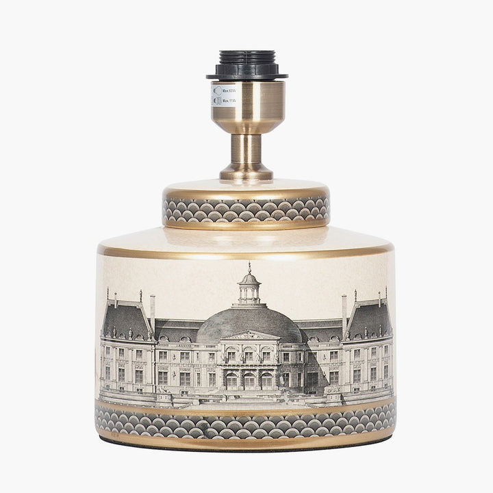 Small and compact this monochrome architectural building print is sat upon a subtle cream background making this a striking detail on this ceramic table lamp. The stylish ceramic table lamp base is complemented with a luxurious black velvet lamp shade, with metallic bronze inner, this stylish lamp is sure to make a statement in your home.
